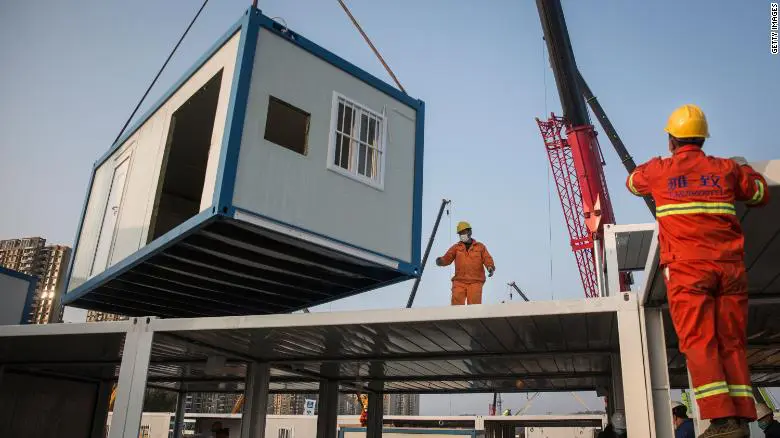 A modular section being lifted into place during the construction of Huoshenshan Hospital